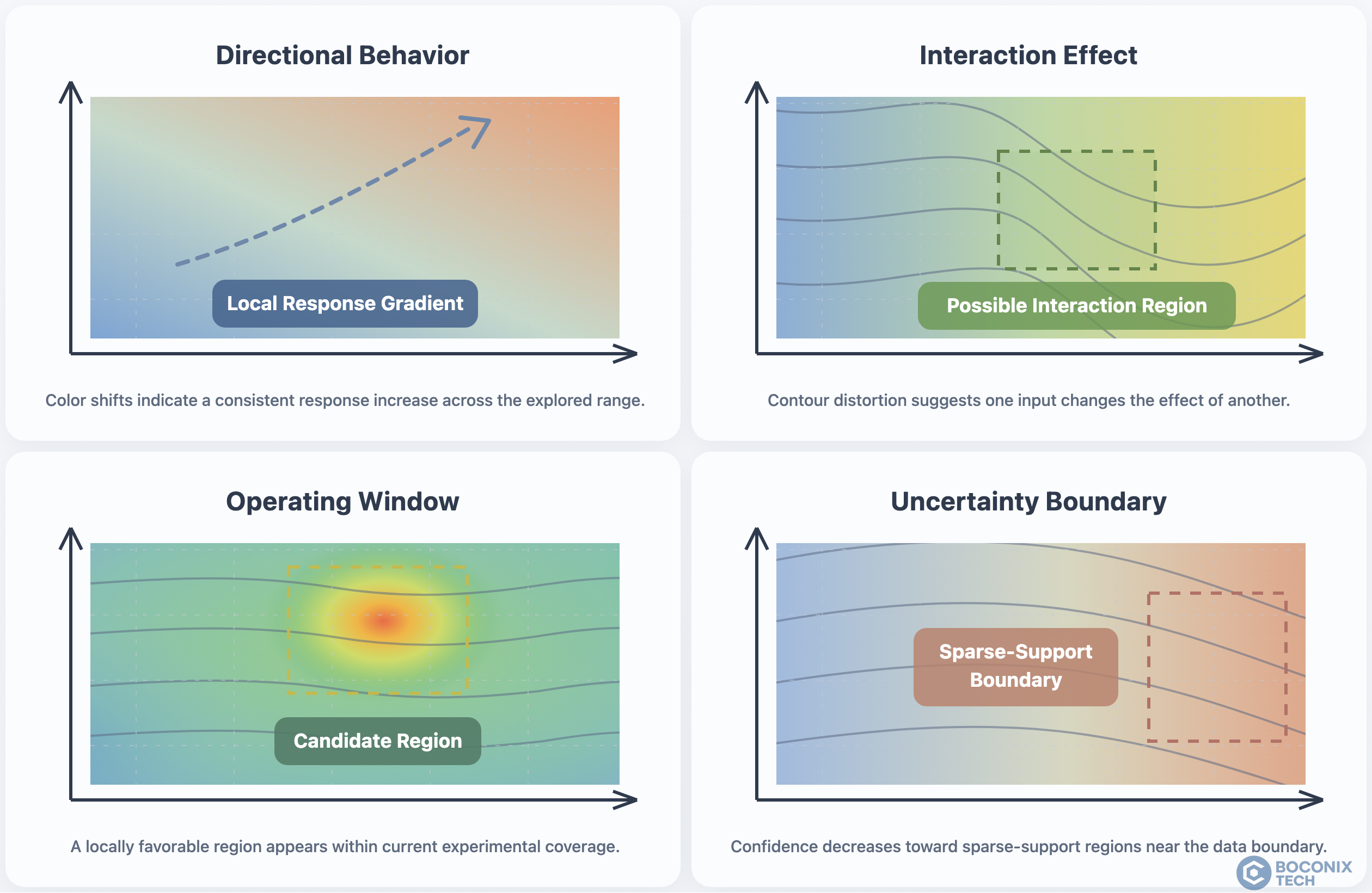 Near the edges of experimental coverage, however, the response structure becomes less certain. These areas form uncertainty boundaries, where limited experimental support makes interpretation less reliable. Uncertainty maps help indicate these practical boundaries by showing where data support becomes sparse and interpretation becomes less reliable.